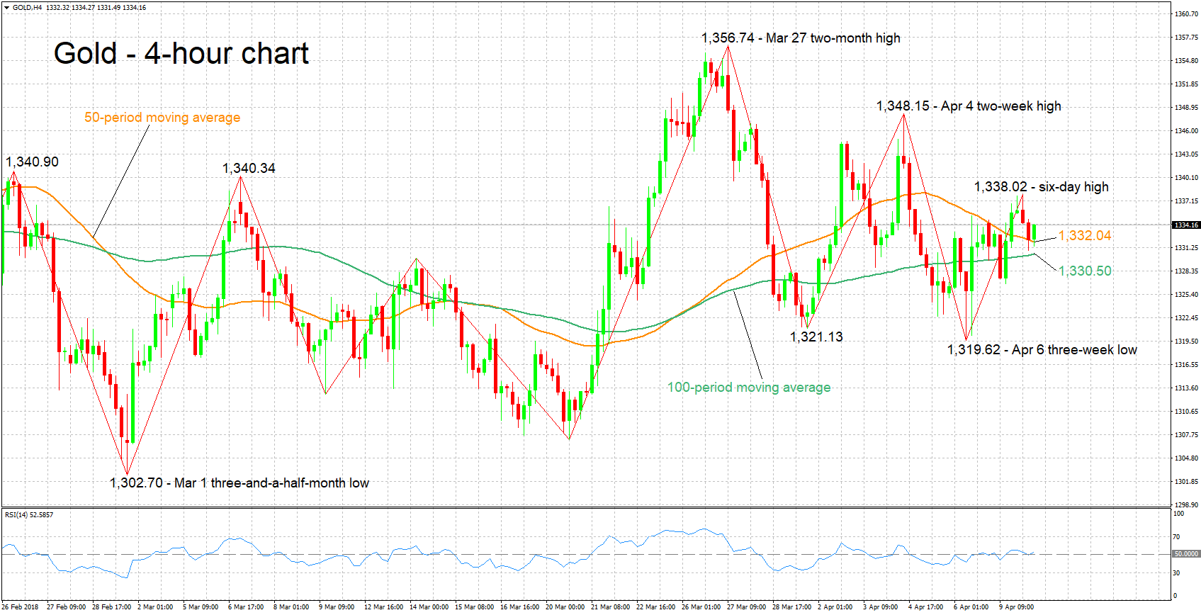 貿易問題への懸念が強まった場合、リスク逃避先資産は上昇するでしょう。この場合、本日前半の6日ぶり高値1338.02ドル付近がレジスタンスゾーンになるでしょう。この付近には、最近の高値も含まれます。
