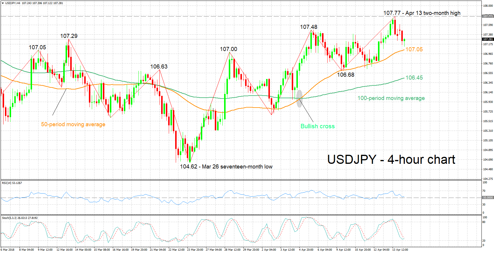 株式市場に関しては、本日に四半期決算を発表する米企業には、バンク・オブ・アメリカ、及びネットフリックスも含まれます。株式市場の全体的な流れは、貿易問題の進展、及びシリア情勢に影響されるでしょう。また、この2つのリスク材料は、外国為替市場の値動きにも影響するでしょう。
