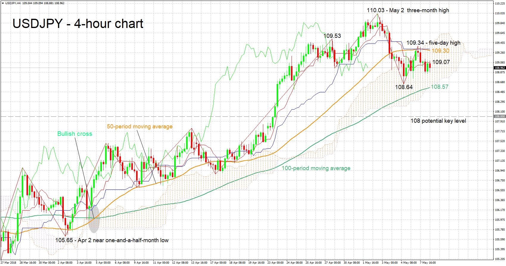 米国の核合意判断で地政学リスクが上昇した場合、資金がリスク逃避先資産の円に流れるため、USDJPYは下落するでしょう。一目均衡表の雲の下限と100日平均線上の108.57円が、サポートゾーンとして機能するでしょう。この付近には、前回の安値108.64円も含まれます。一段と下落した場合には、108円が視野に入るでしょう。