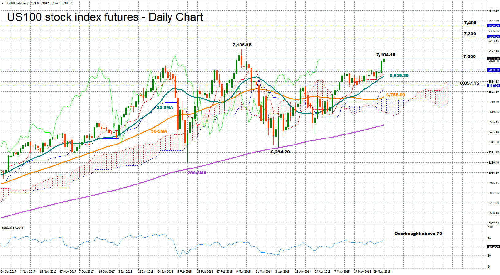 下落相場では、7000ドル台と20日SMAの6929.39ドルがサポートゾーンになるでしょう。その下には、4月の高値6857.15ドルが控えています。一段と下落した場合、50日SMAの6755.09ドルが視野に入るでしょう。