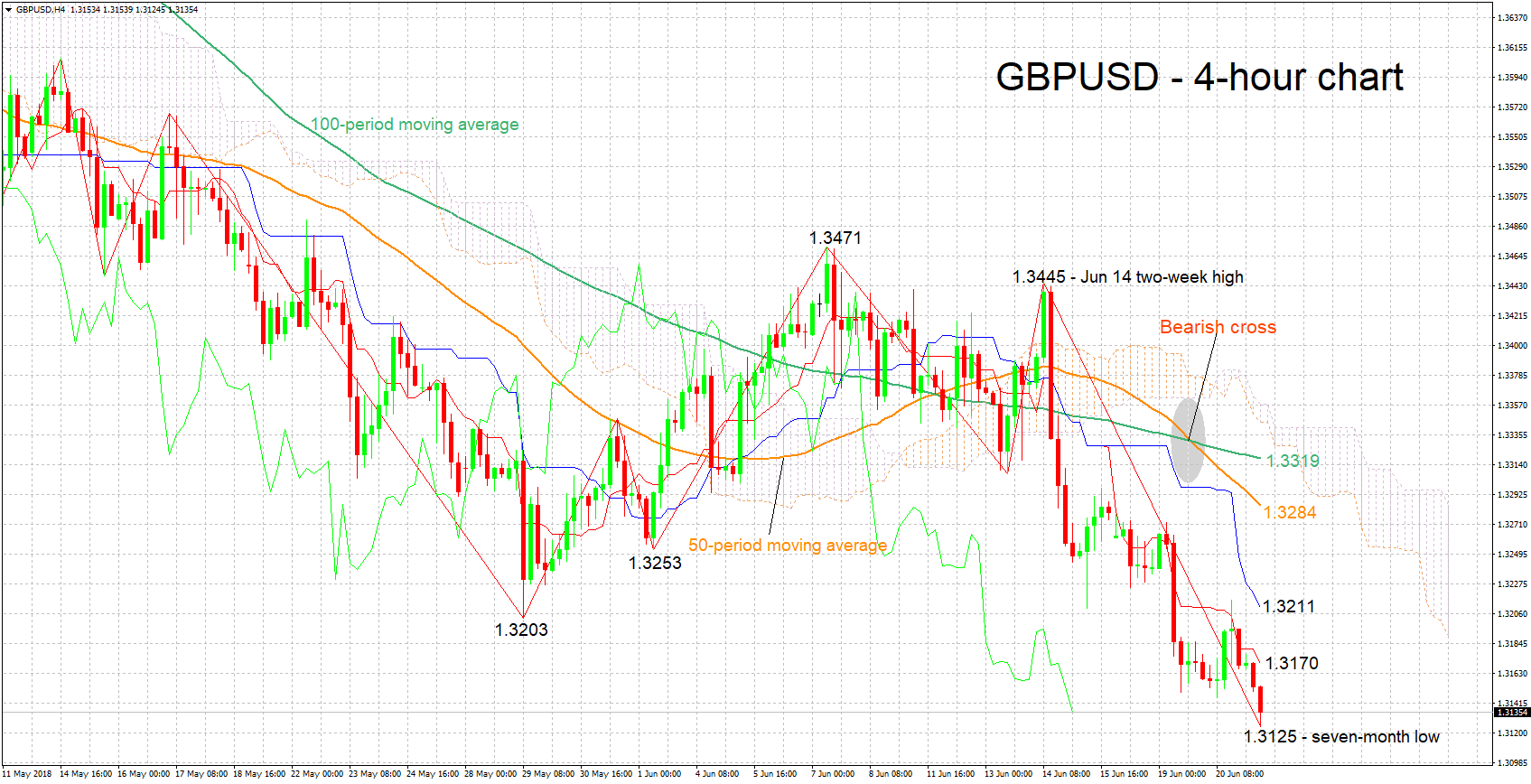 GBPUSDは6月中旬に2週ぶり高値1.3445ドルまで上昇後、大幅に下落しました。本日前半には、7か月ぶり安値1.3125ドルを更新しました。転換線と基準線の下落も短期的弱気相場を示しています。しかしながら、遅行スパンが売られ過ぎ市場を示している可能性があり、短期的な相場転換の可能性も残っています。