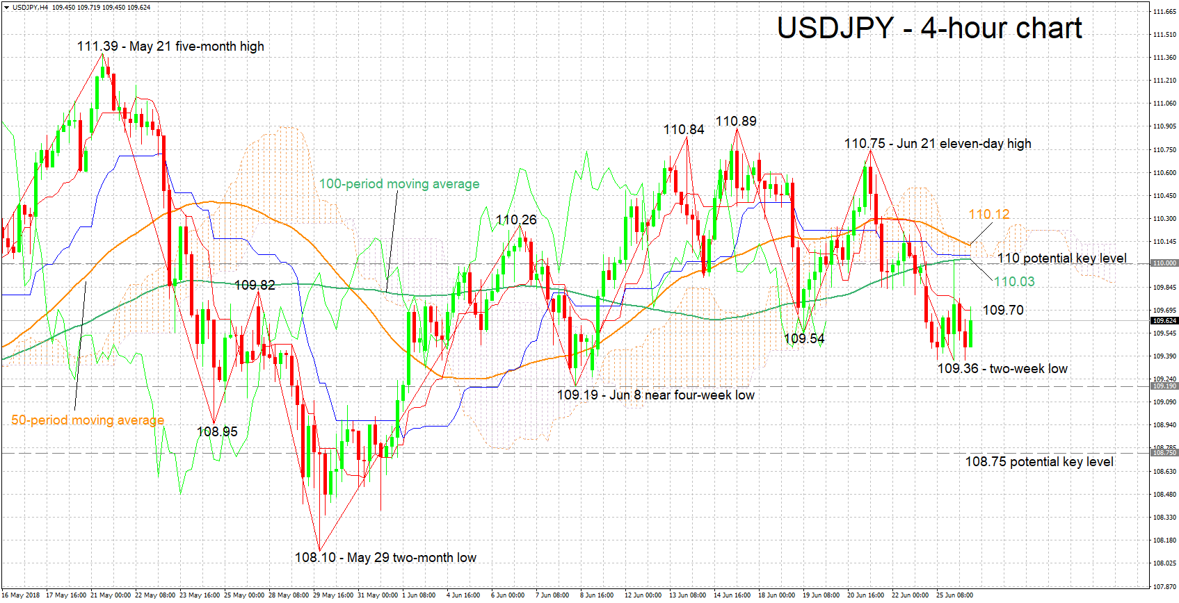 貿易問題のリスクが上昇した場合、リスク逃避先資産の円が上昇するでしょう。したがって、USDJPYは下落します。昨日の2週ぶり安値109.36円が直近のサポートポイントとなり、その下には6月8日に記録した約4週ぶり安値109.19円が控えています。一段と下落した場合、5月下旬から6月上旬にかけて数回に渡って記録した108.75付近が視野に入るでしょう。