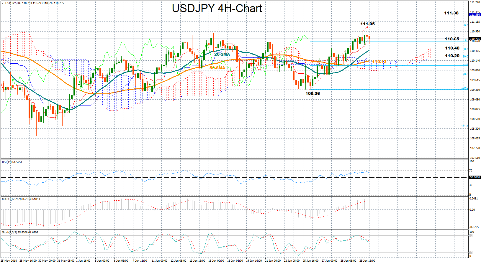 本日、USDJPYは111円台越えを達成し、6週ぶり高値を更新したものの、111円台を維持することができませんでした。4時間チャート上のRSIとストキャスティックは買われ過ぎを示しています。USDJPYは6月26日より上昇基調を継続しているものの、RSIとMACDの上昇勢いが鈍化し、基準線を上回った転換線が平坦化しつつあることから、短期的に上昇トレンドが止まる可能性があります。