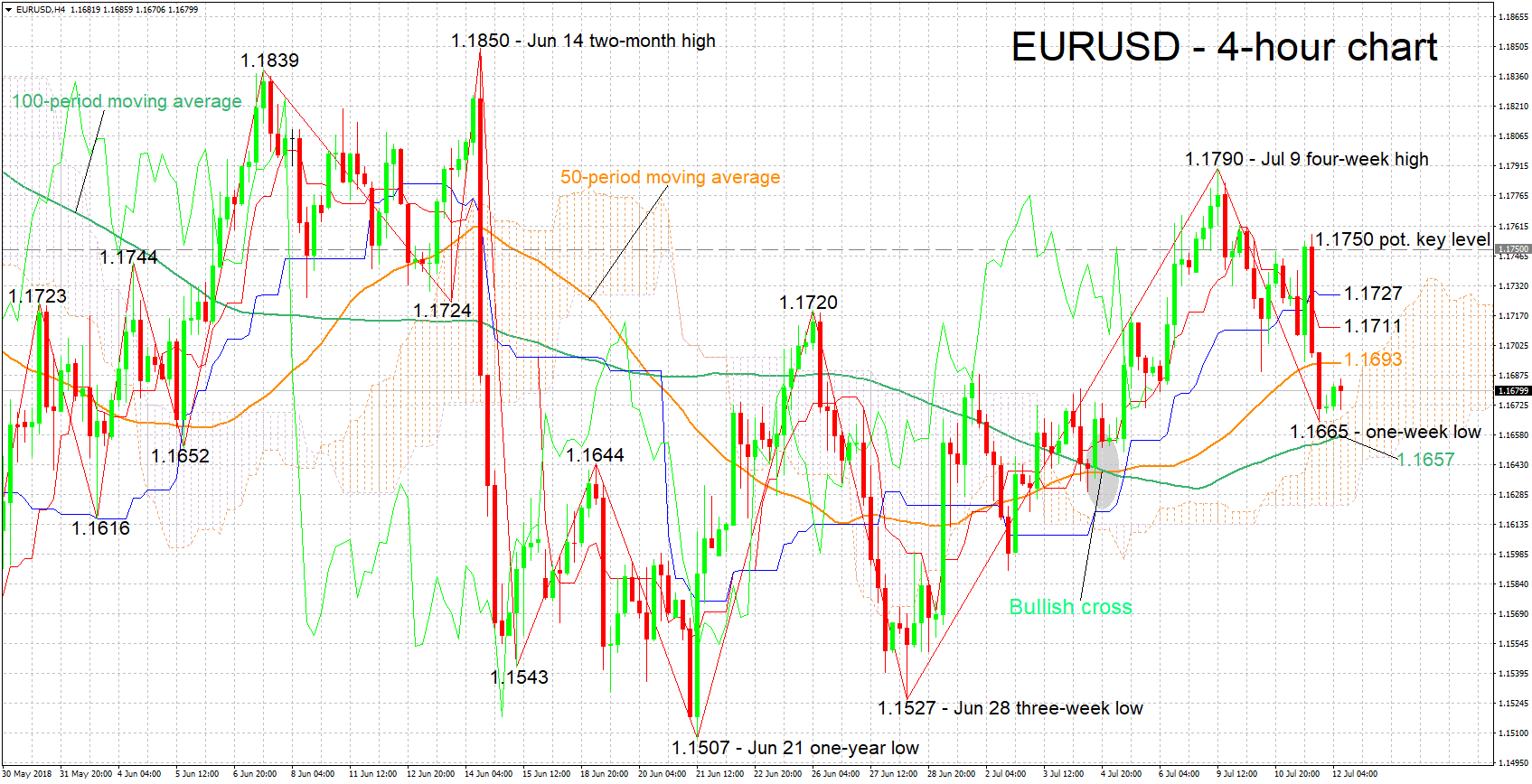 反対に、ECB議事録がハト派的内容となった場合、EURUSDは下落するでしょう。直近のサポートゾーンは、100日MAの1.1657ドル付近になるでしょう。この付近には、昨日の1週間ぶり安値であり、一目均衡表の雲の天井値でもある1.1665ドルも含まれます。一段と下落した場合、一目均衡表の雲の底値1.1623ドルが視野に入るでしょう。