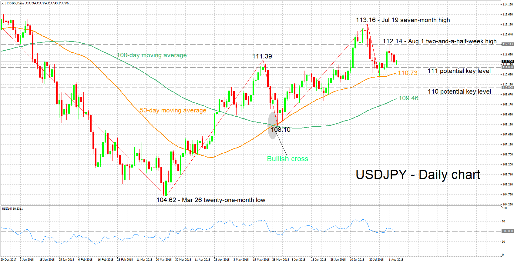 米中貿易問題のリスク上昇により円買い圧力が強まった場合、USDJPY は下落するでしょう。この場合、111円付近が直近のサポートゾーンになるでしょう。111円の下には、50日平均線上の110.73円、及び7月26日に記録した1か月ぶり安値110.58円も控えています。一段と下落した場合、110円台が視野に入るでしょう。