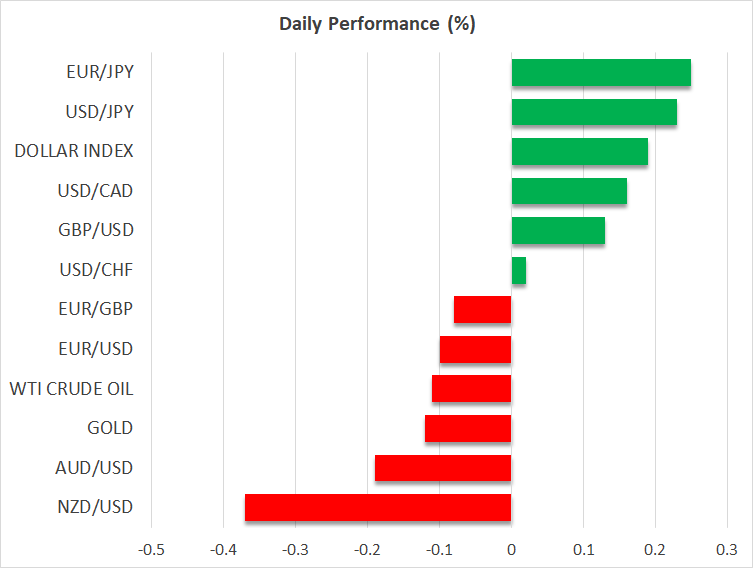 ユーロと円の下落を受けて、米ドルインデックスは96.20越えとなりました。安全資産の円は、全面安となり、緩やかなリスクオンムードが浮き彫りとなりました。しかしながら、リスク通貨の豪ドル、NZドル、及びカナダドルは対米ドルで下落し、特にNZドルは最も下落しました。