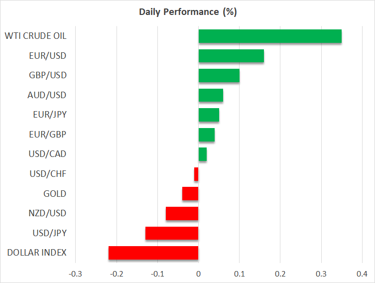 リスクオン回復の流れは、外国為替市場にも波及し、米ドルの上値が重くなり、その他の通貨が上昇しました。明日にイングランド銀行とECBの政策会合を控え、ポンドとユーロが米ドル下落の恩恵を受けました。
