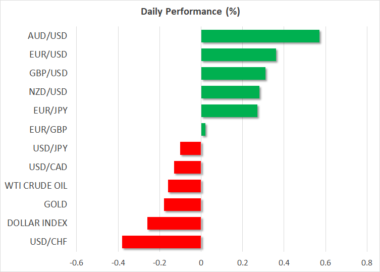 本日の市場ムード改善を受けて、リスク通貨の豪ドルとNZドルも上昇しました。一方で、米ドルと円は下落しました。スイスフランの下落幅は限定的でした。