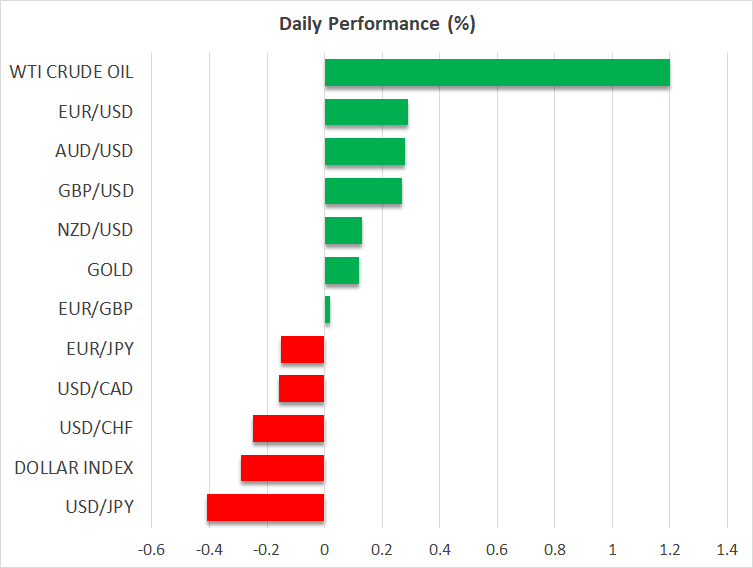 市場のリスクオンムードのより、米ドルは上値の重い展開となりました。ドル/円の下落により、安全資産の円は若干回復しました。