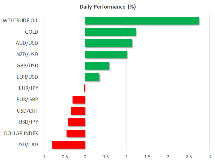 外国為替市場では、リスクオンの流れが一部回復を背景に、米ドルは昨日の大幅な上昇幅の一部を失い、概ね米ドル安の展開となりました。本日、WTI原油先物指数が3週ぶり高値を更新した為、豪ドルとNZドルは大きく回復し、カナドルもその後に続きました。