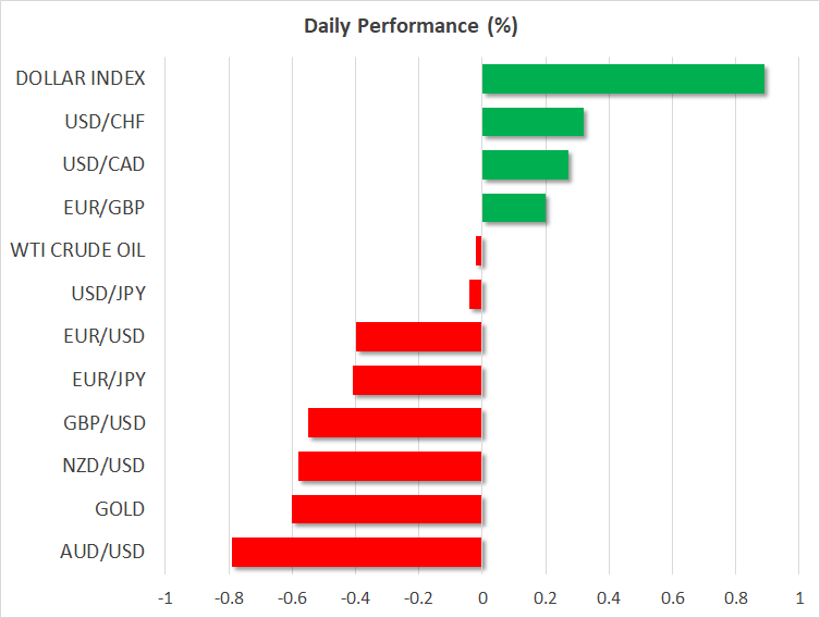 本日の豪ドルは最も下落しており、昨日のオーストラリアの雇用統計が堅調であったことを背景とした一時的な上昇が反転しました。スイスフランも米ドルに対して4か月ぶりの安値まで低下しており、ユーロは1.08ドルの水準近くで取引され、ポンドは1.26ドルを下回って1か月ぶりの安値を下回りました。