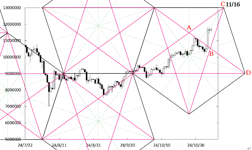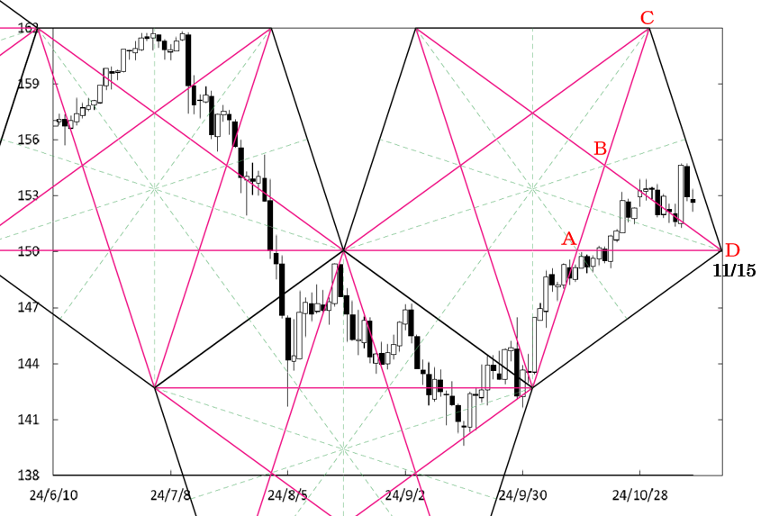 ABラインに沿って下落し、B点が位置する時間帯にB点に引き寄せられたNY金は右肩上がりのBDラインに沿って反発する動きを見せた。しかし、先週末にはBDラインを割り込んだことから、C点が位置する時間帯までは上値の重たい展開が続く可能性がある。
