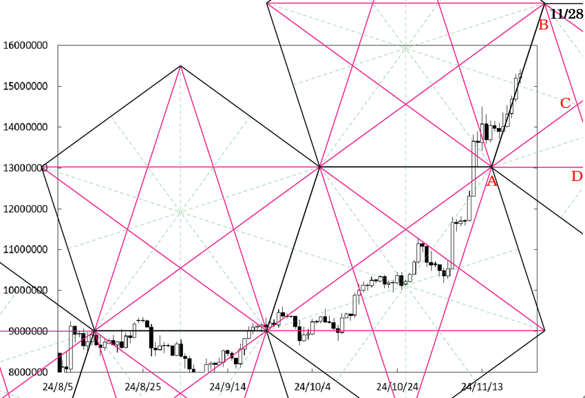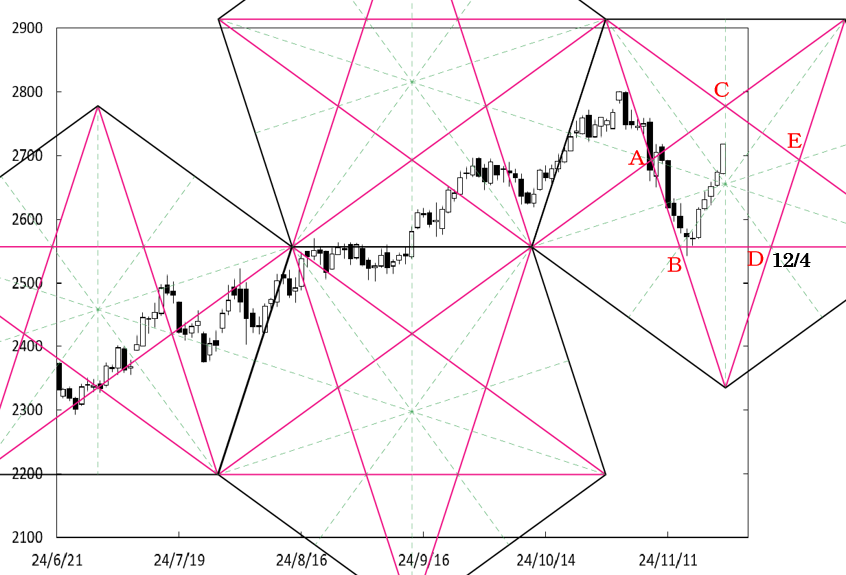 ここではC点に注目したい。先週末にC点が位置するペンタゴンのど真ん中の時間帯に到達した。したがって、ペンタゴンのど真ん中の時間帯が変化日となり、流れが変わる可能性がある。しかも、右肩下がりのCEラインが上値抵抗線として存在している。故に、徐々に上値は重たくなると考えたい。
