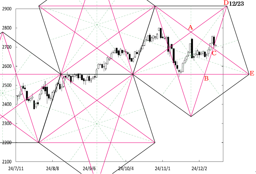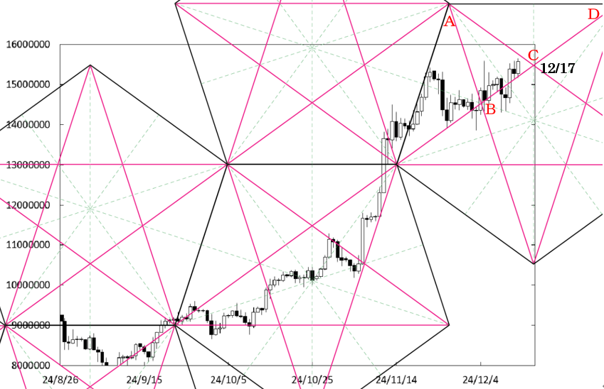 週明けにC点が位置するペンタゴンのど真ん中の時間帯を通過する。したがって、ど真ん中の時間帯が変化日となり、流れが変わる可能性はある。ただし、BCDラインを割り込まない限り上昇トレンドは続くと考えられる。1600万円にチャレンジか。