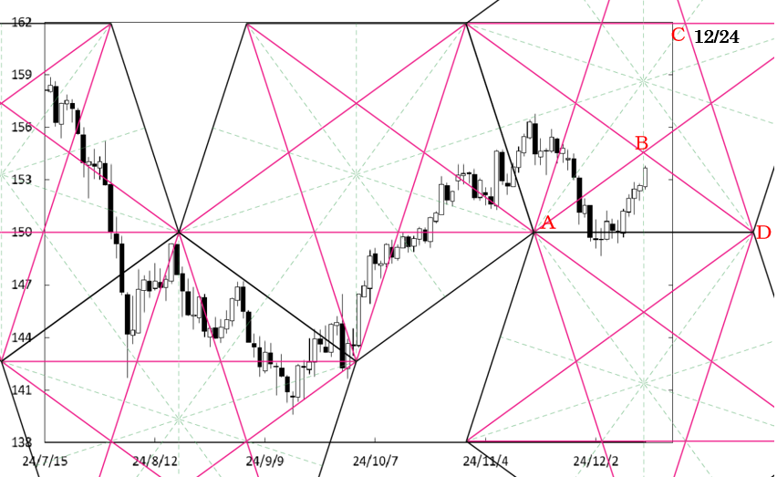 ADラインが下値支持線となり上昇に転じ、B点が位置するペンタゴンのど真ん中の時間帯に大きな陽線が出現している。上昇した分、週明けに押す場面の可能性もあるが、150円を割り込まない限りは堅調な展開は続き、BDラインを超えて155円を試す動きが考えられる。