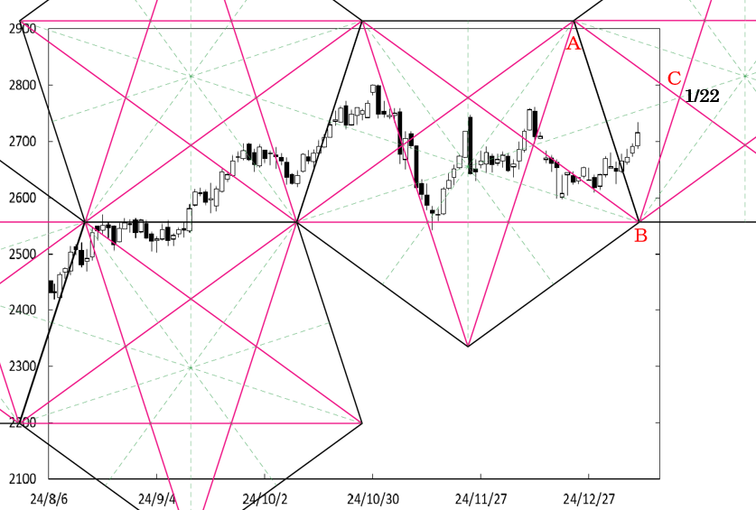 右肩下がりで上値抵抗線として存在しているABラインを超えて堅調な展開を見せいている。しかし、先週末にB点が位置する時間帯に到達。B点が位置する時間帯が変化日となり、流れが変わる可能性がある。この場合、再び2,600ドル台に戻してくることが考えられる。