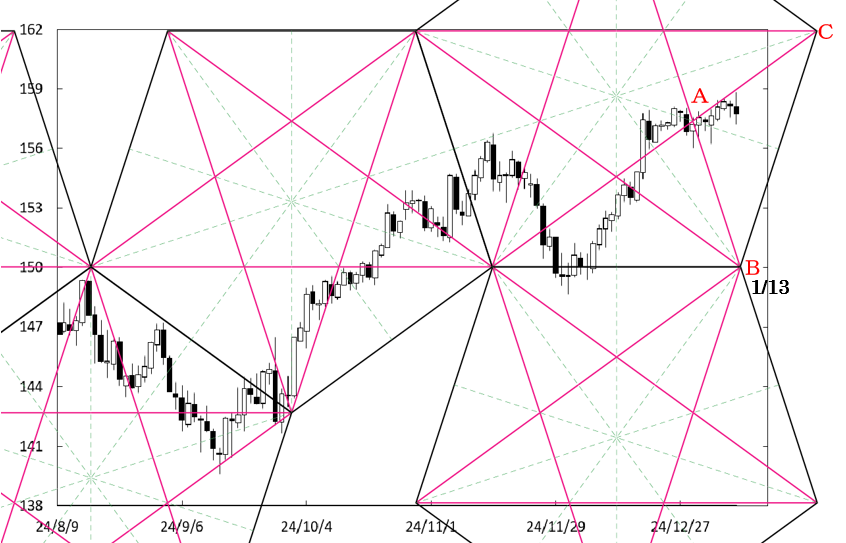 B点に注目したい。週明けにB点が位置する時間帯を通過する。したがって、B点が位置する時間帯が変化日となり、流れが変わる可能性がある。また、現在値もACラインの下方を推移していることから、ACラインから下放れることも考えられる。