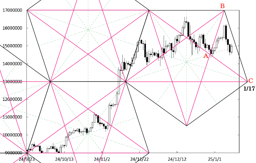 A点が位置する時間帯より再び上昇に転じたものの、B点が位置する時間帯より値を下げてきている。右肩下がりのBCラインが上値抵抗線として存在していることから、BCラインに沿って値を下げる可能性がある。ここでA点水準(1450万円)を割り込んでくると、弱気が広がり1400万円を割り込んでいくことも考えられる。