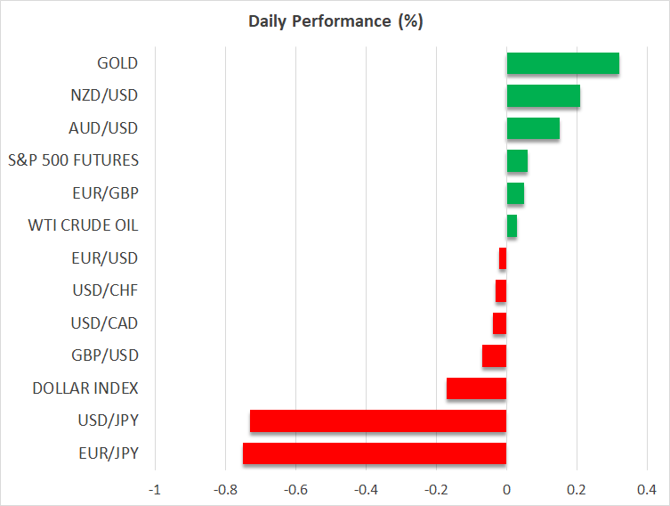 米インフレに関するいくらか明るいデータを背景に、米国債の売りが緩和する中、リスク選好度は本日引き続き改善しました。米10年債利回りは4.78%辺りで取引されており、先週更新した1年以上ぶりの高水準である4.8050%から後退している一方、米ドルは本日の前半のセッションにて、主要通貨に対して1週間ぶりの安値付近まで一時下落しました。