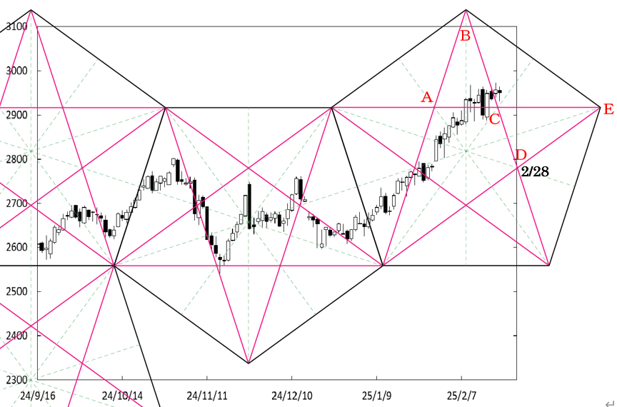 しかし、先週末にC点が位置する時間帯に到達したことに加え、同事線が出現していることから、押し目を形成すると考えたい。2,900ドル割れか。