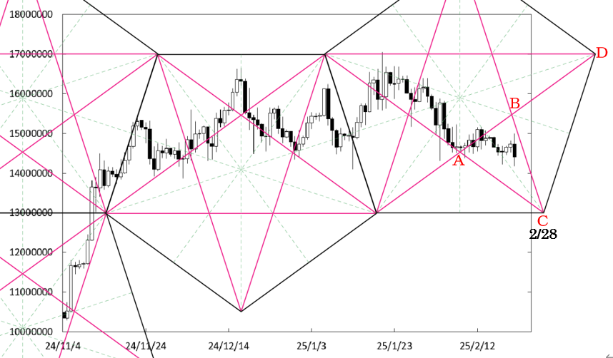 昨年の11月以降、1400万円が下値水準となっているのだが、その水準に到達。したがって、1400万円を下回るも一時的に下げ止まる可能性があると考えたい。