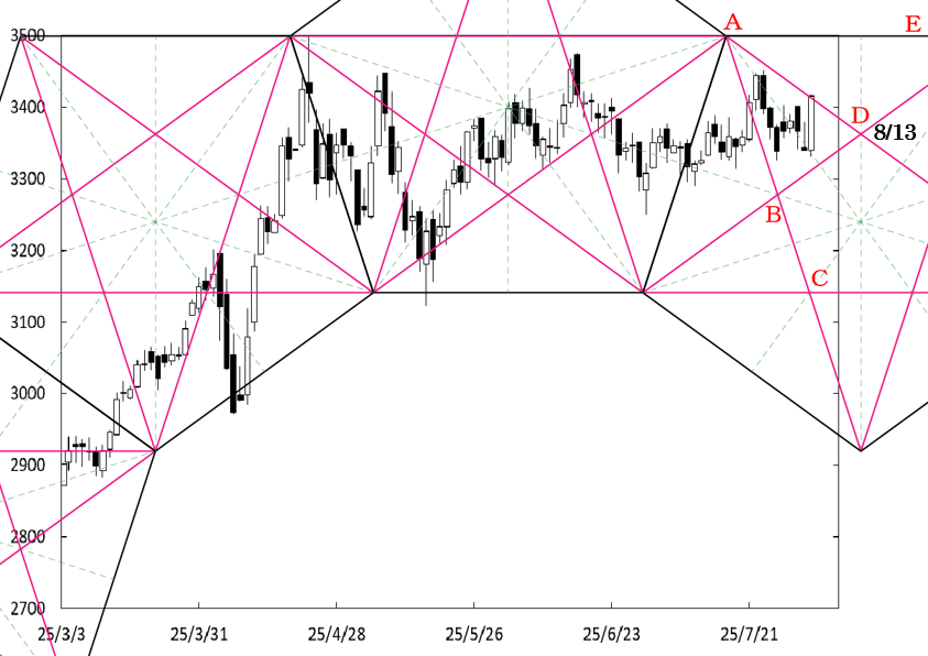 B点が位置する時間帯で下げ止まったNY金は3,300ドル台で推移していたのだが、先週末にC点が位置する時間帯に到達すると大きく上昇。3,400ドル台に乗せてきた。