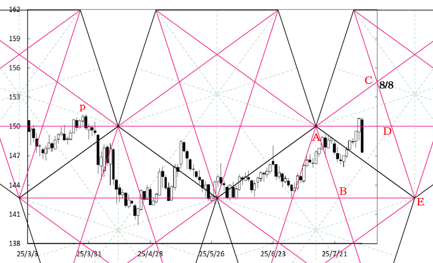 B点が位置する時間帯で下げ止まりから上昇に転じたドル円はADラインを超えて150円台に乗せてきた。しかし、3月高値(p点)が節目となり、大きく下落した。