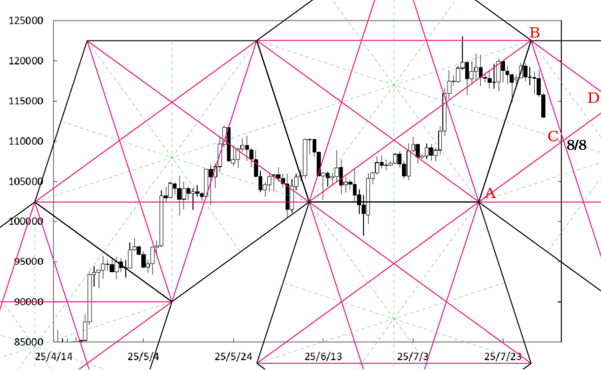 高値水準でもち合いが続いていたビットコインだが、B点が位置する時間帯を通過すると大きく下落。BCラインに沿って値を下げている。