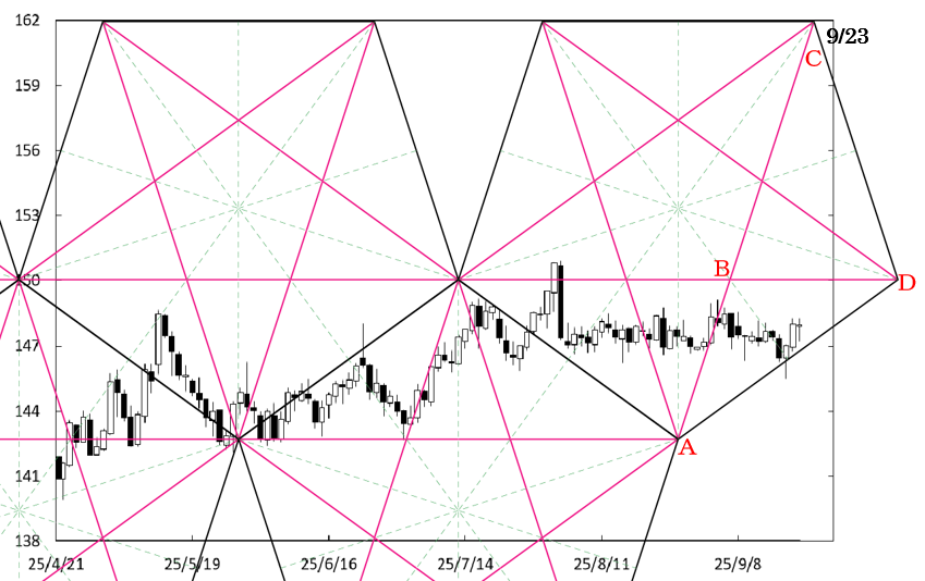 ここではB点にも注目したい。週末にかけてB点が位置する時間帯を通過する。したがって、B点が位置する時間帯が変化日となり、新しい流れが出てくるのか否かがポイントになる。