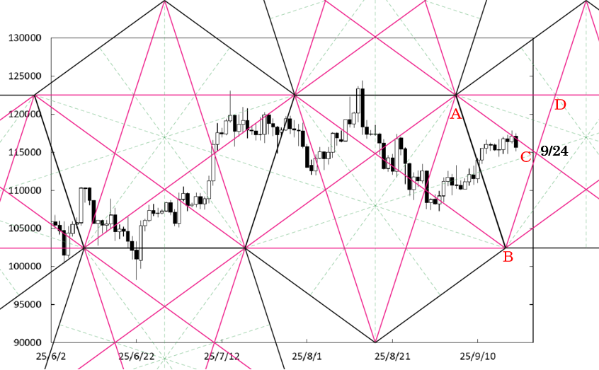 また、週央にC点が位置する時間帯を通過する。したがって、C点が位置する時間帯が変化日となり、新しい動きが出てくるのか否かがポイントになる。