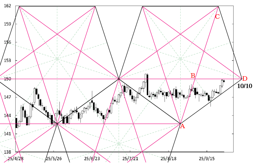 逆にE点が位置する時間帯が変化日となり、流れが変わる可能性がある。また、D点が位置する時間帯も変化日となり、下げ止まる可能性もある。そして、右肩上がりのBEラインも下値支持線として控えている。