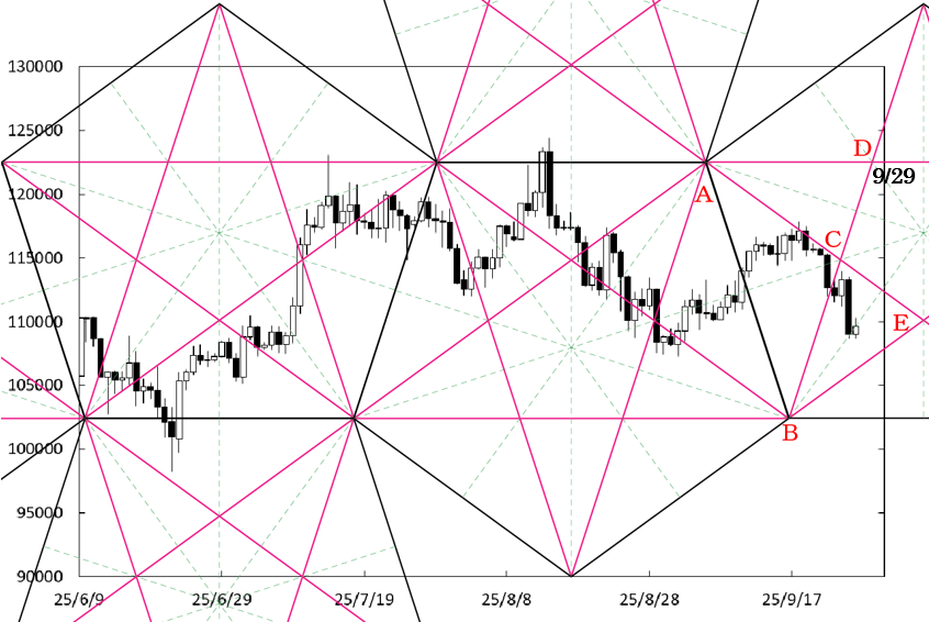 B点が位置する時間帯に右肩下がりのACラインに到達したビットコインだが、その後、ACEラインが上値抵抗線となり上値の重たい展開が続いている。しかも、C点が位置する時間帯と通過した後も値を下げている。この場合、105,000ドルを試す動きになっていこう。
