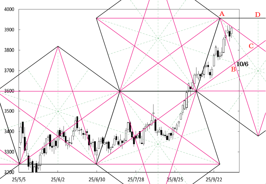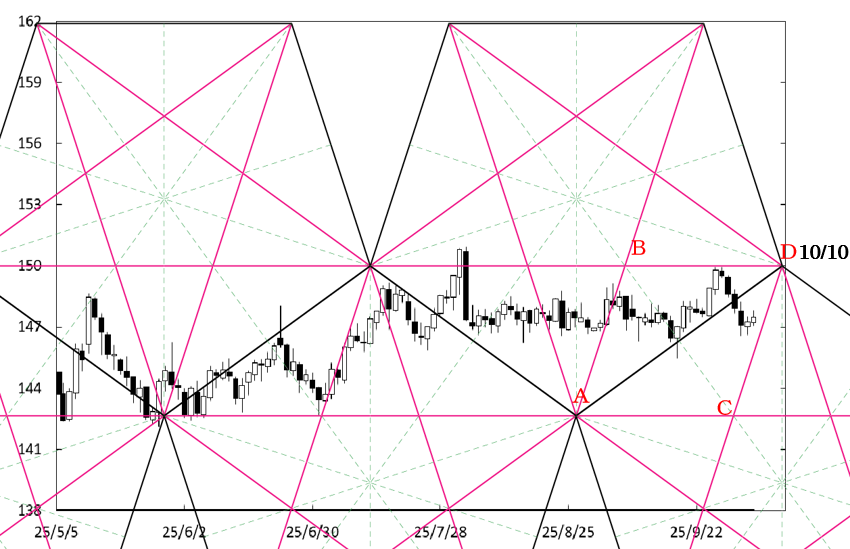 ここではB点に注目したい。週明けにB点が位置する時間帯を通過する。したがって、同点が位置する時間帯が変化日となり、新しい流れが出てくるのか否かがポイントになる。