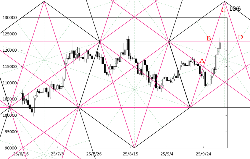 ここではC点に注目したい。週明けにC点が位置するペンタゴンのど真ん中の時間帯を通過する。したがって、ペンタゴンのど真ん中の時間帯が変化日となり、新しい流れが出てくるのか否かがポイントになる。