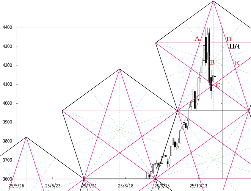 ADラインを越えて4,400ドルに迫ったものの、大きく下落。B点が位置するペンタゴンのど真ん中の時間帯にかけてC点に引き寄せられた。