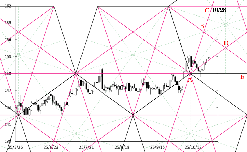 AEラインが下値支持線となり下げ止まりから上昇に転じている。ここからも、150円が下値のメドであることがわかる。