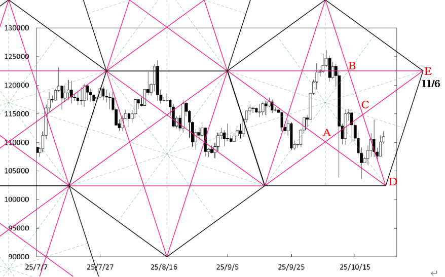 ここではD点に注目したい。先週末にD点が位置する時間帯を通過した。したがって、同点が位置する時間帯が変化日となり、新しい流れが出てくるのか否かがポイントになる。