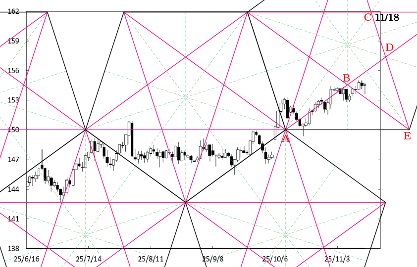 一方、C点に注目したい。週明けにC点が位置する時間帯が変化日となり、流れが変わる可能性があるからだ。この場合、152円を試すことが考えられる。