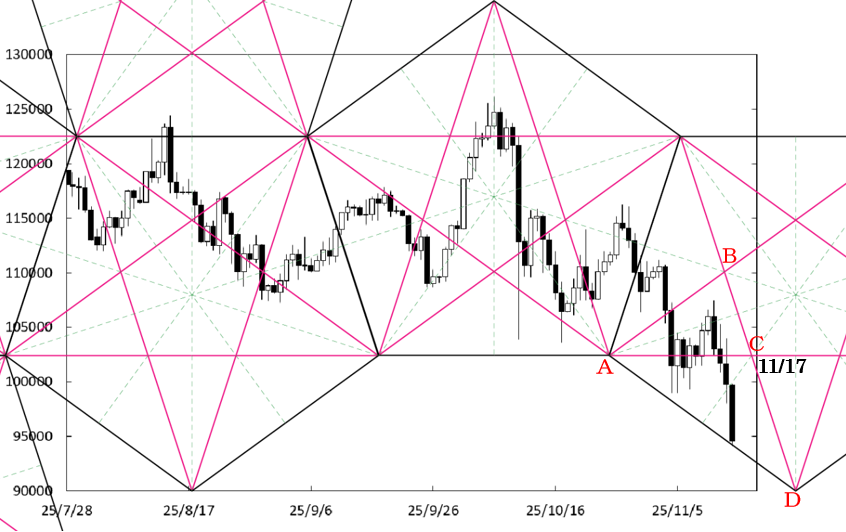 ここではADラインに注目したい。ADラインを割り込むと『時間の逆行』状態となる。しかし、時間の逆行はペンタゴンチャート上あってはならない状態であることから、ADラインを割り込む確率は低いと考えられる。また、C点が位置する時間帯も週明けに通過することから、流れが変わる可能性もある。故に、下値を探る展開が続いたとしても、目先は9,000ドルが下値か。