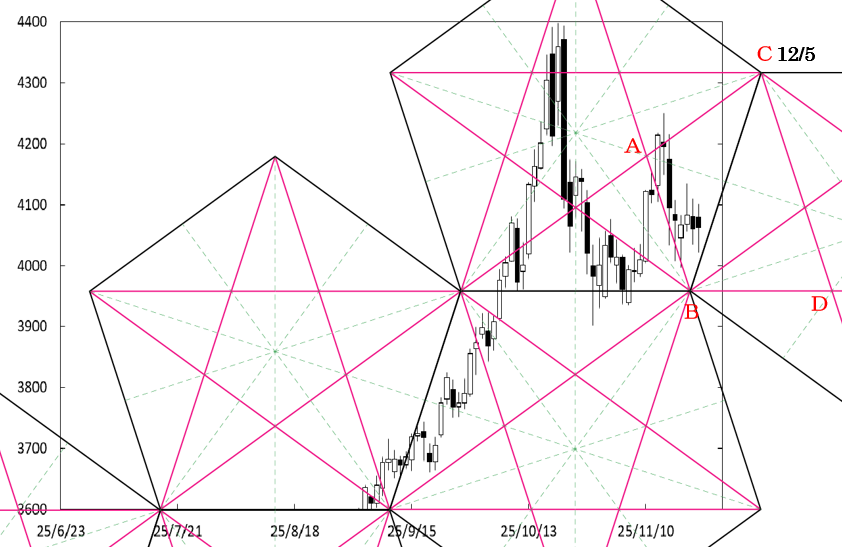 ここではD点に注目したい。週明けにD点が位置する時間帯を通過する。したがって、同点が変化日となり新しい動きが出てくる可能性があるからだ。