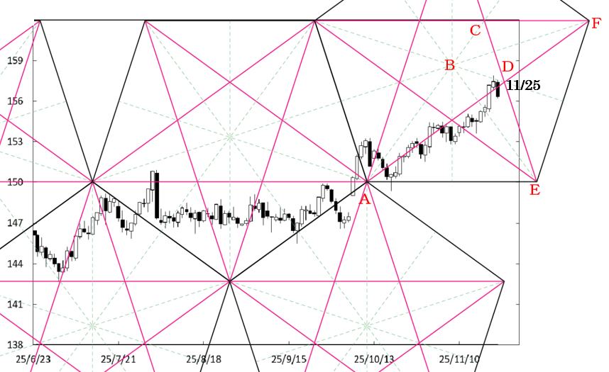 一方、上値の重たい展開に移行する可能性が出てきた。D点が位置する時間帯が変化日となり流れが変わる可能性があることに加え、右肩下がりのCDEラインが上値抵抗線として存在している。そして、中心点であるB点の下方を通過したことで、CFラインを超えていく確率は低い。すなわち、上値は限定的。この場合、153円を試す動きになっていこう。
