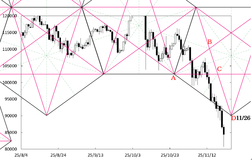 ここでは、ADラインに注目したい。時間の逆行はペンタゴンチャート上あってはならないこと、とされている。したがって、D点が位置する時間帯までもADラインを超えていくことが期待される。すなわち、9,000ドル台に戻す場面を期待したい。