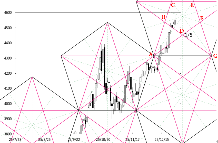 年明けにD点が位置するペンタゴンのど真ん中の時間帯を通過する。故に、ど真ん中の時間帯が変化日となり、新しい動きが出てくるのか否かがポイントになる。高値を更新していることから、トレンドの変化に注意をしたい。