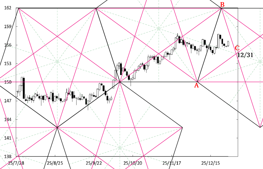 年末にC点が位置する時間帯を通過する。したがって、同点が位置する時間帯が変化日となり、新しい動きが出てくるのか否かがポイントになる。故に、年末年始の動きには注意をしたい。