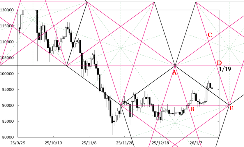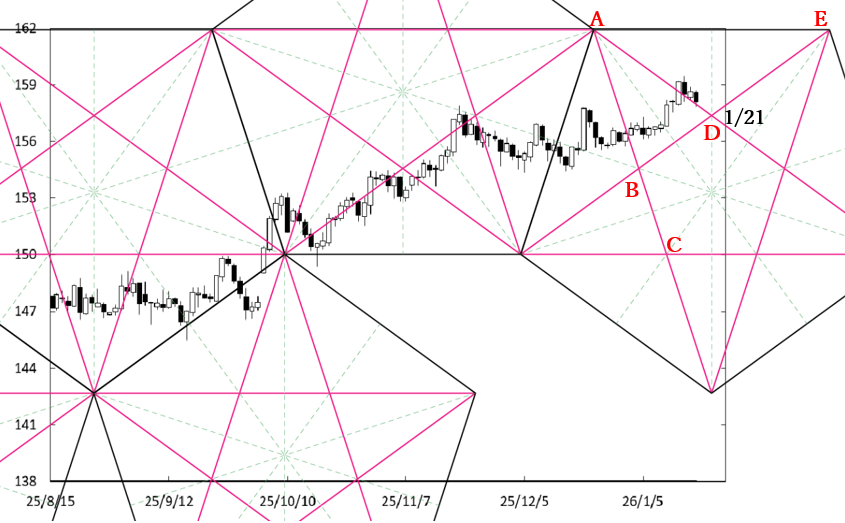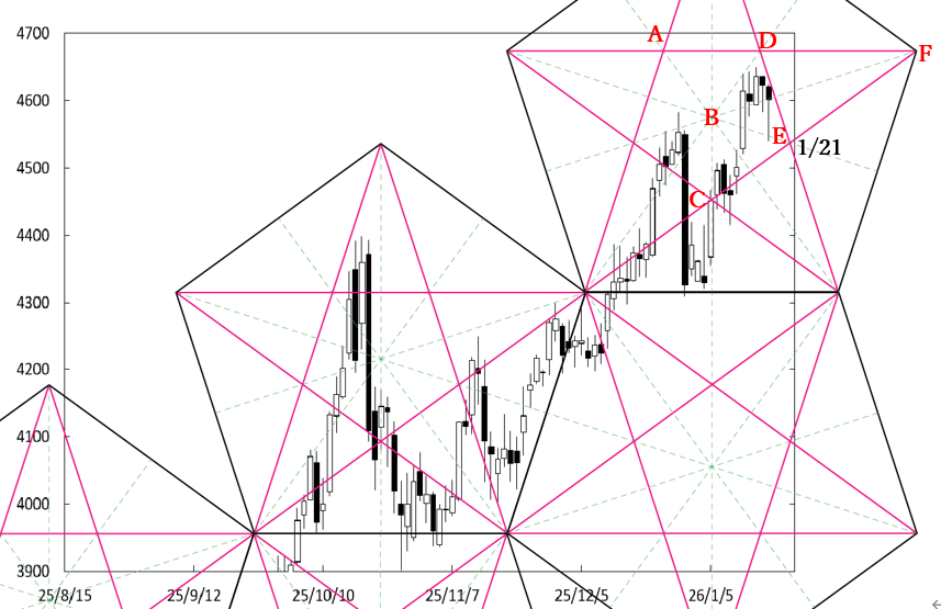 週央にD点が位置するペンタゴンのど真ん中の時間帯を通過する。したがって、ペンタゴンのど真ん中の時間帯が変化日となり、新しい動きが出てくるのか否かがポイントになる。