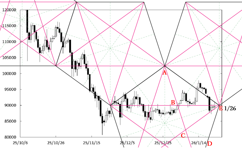 週明けにE点が位置する時間帯を通過する。したがって、同点が位置する時間帯が変化日となり、新しい動きが出てくるのか否かがポイントになる。また、E点の上方を通過するのか、下方を通過するのかも要注目である。