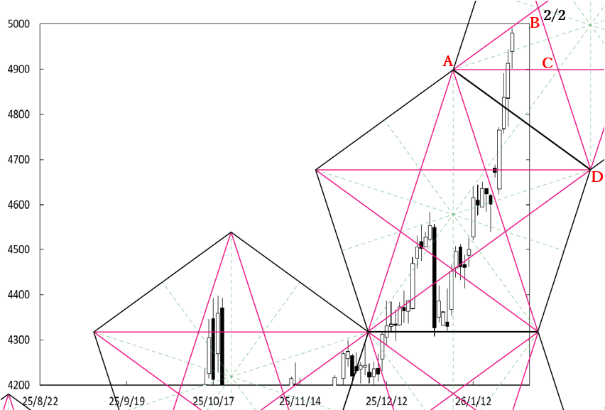 目標の4,800ドル到達および右肩下がりのADラインが上値抵抗線となり押し目を形成すると思われたが、NY金はADライン、ACラインを越えて5,000ドルに接近している。