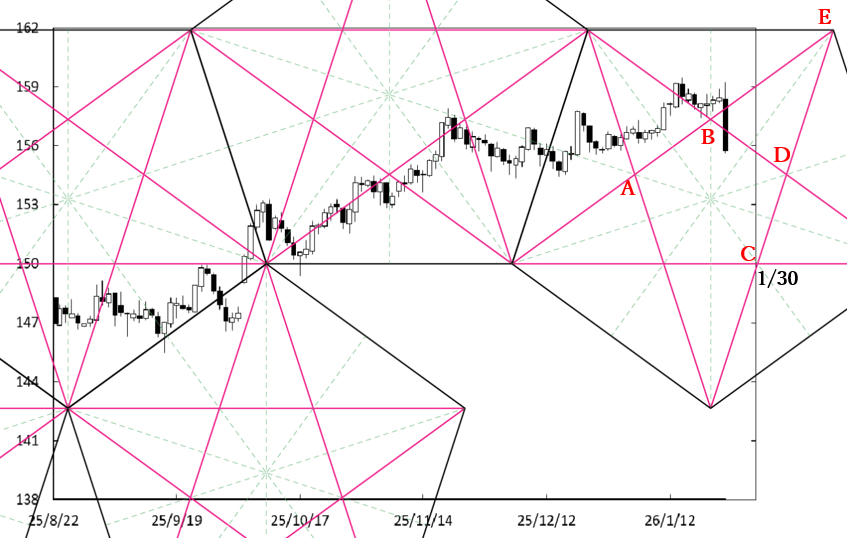 月初にB点が位置する時間帯を通過する。したがって、同点が位置する時間帯が変化日となり、新しい動きが出てくる可能性がある。故に、月末月初の動きに要注目である。