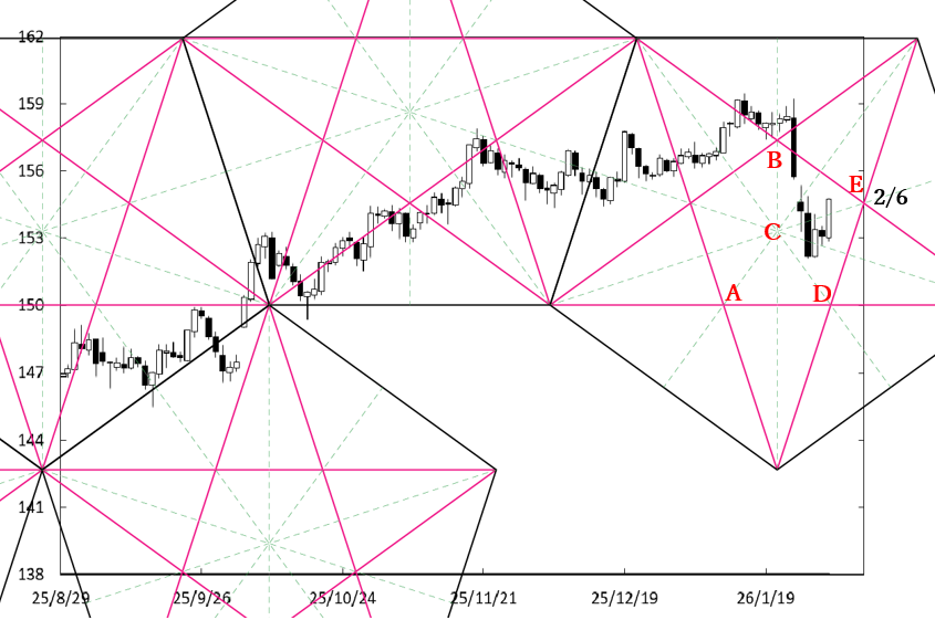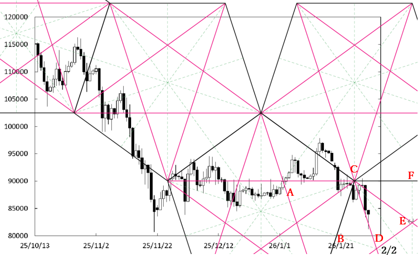 C点が位置する時間帯にC点の下方を通過したことで、BCラインを越えて形でペンタゴンが描き足された。したがって、CFラインが強い上値抵抗線として出現している。したがって、上値の重たい展開が続くことが考えられる。
