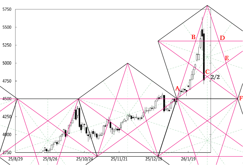 週明けにC点が位置するペンタゴンのど真ん中の時間帯を通過する。したがって、ペンタゴンのど真ん中の時間帯が変化日となり、新しい動きが出てくるのか否かがポイントになる。